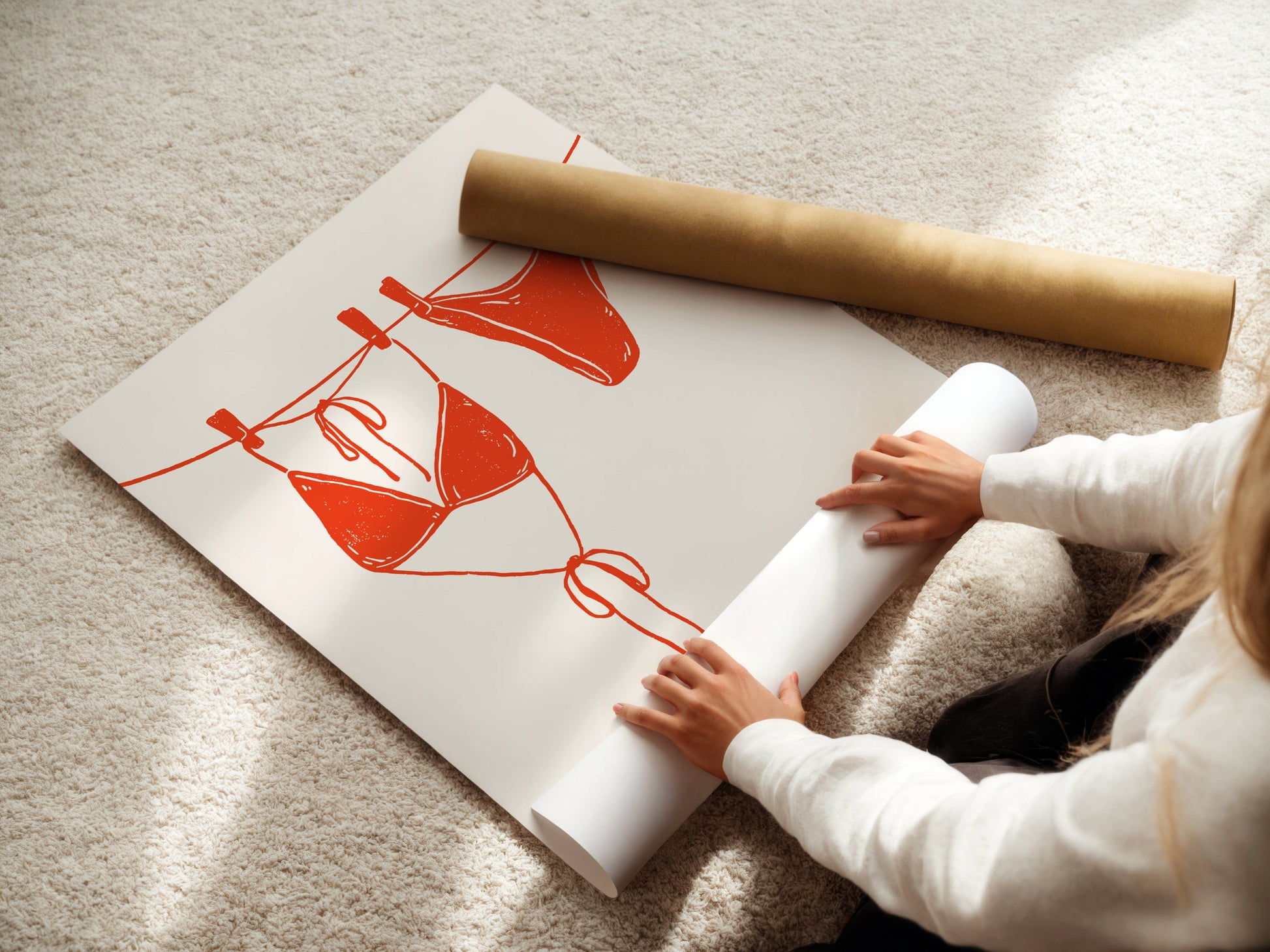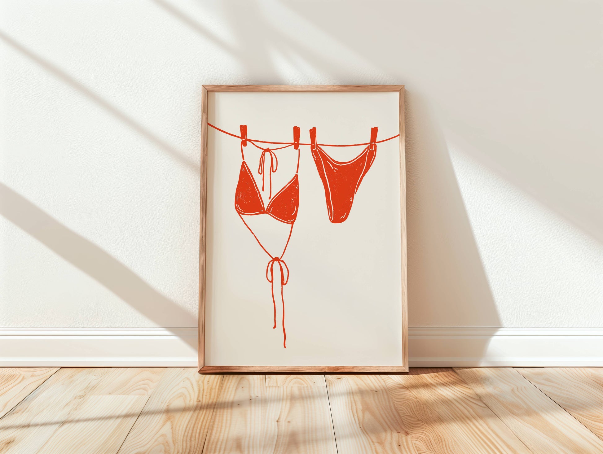 Sunny beach days and salty air come to life in this hand-drawn bikini print. Inspired by carefree Mediterranean summers, it captures that simple joy of swimsuits drying on a line after a day by the sea. Perfect for adding a fun, stylish touch to bedrooms, bathrooms, or any space that celebrates travel, summer memories, and coastal living.
