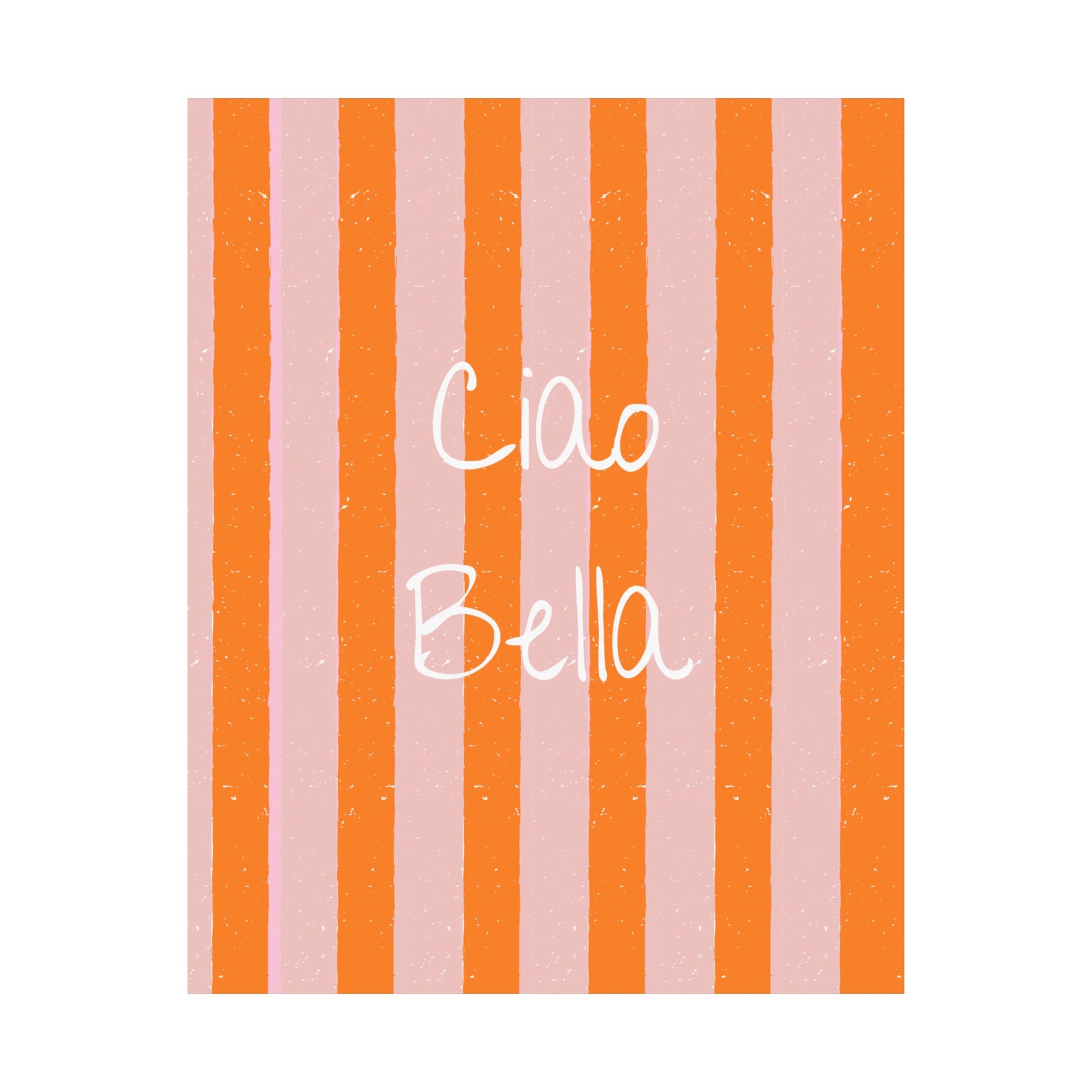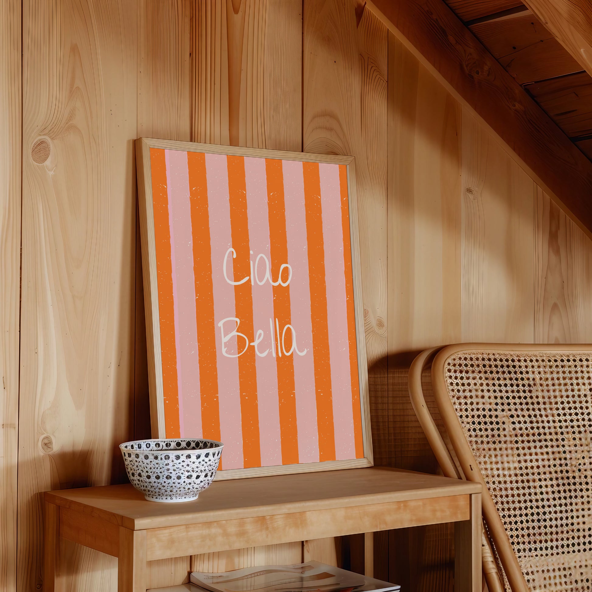 Add a little Italian sunshine to your walls with this playful “Ciao Bella” quote art print. Featuring warm orange and soft blush stripes, this design brings a modern retro touch and that effortless Mediterranean charm to any room.