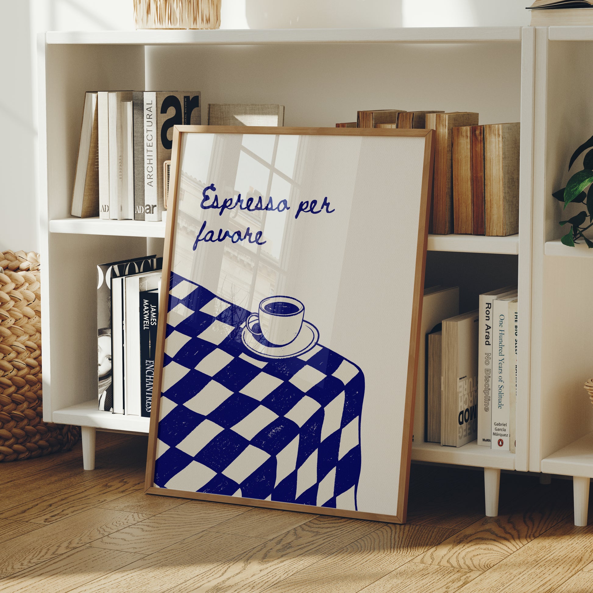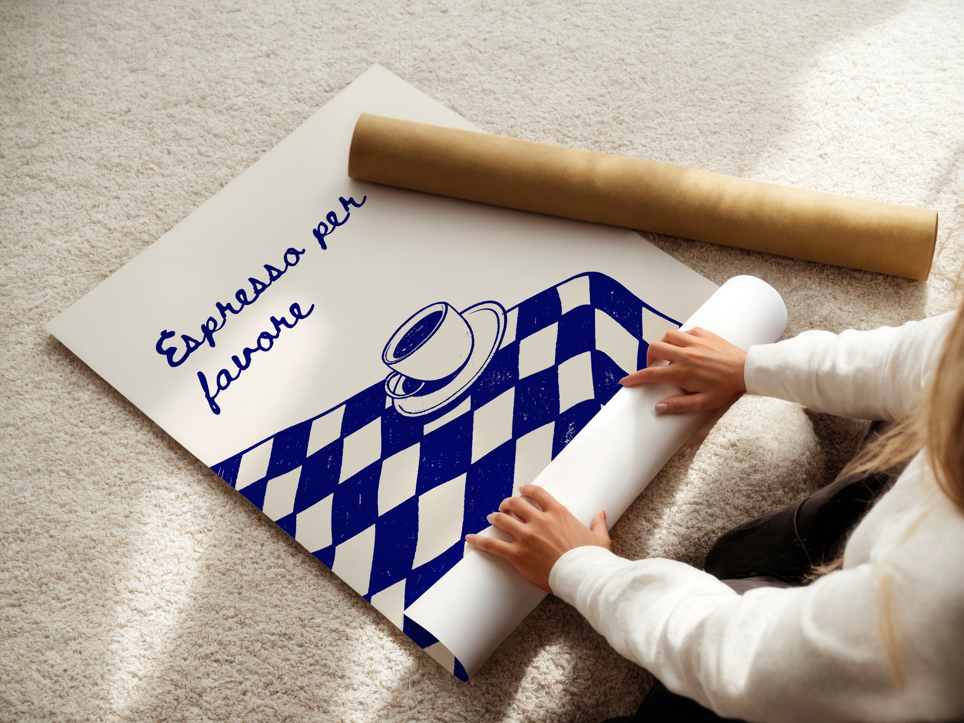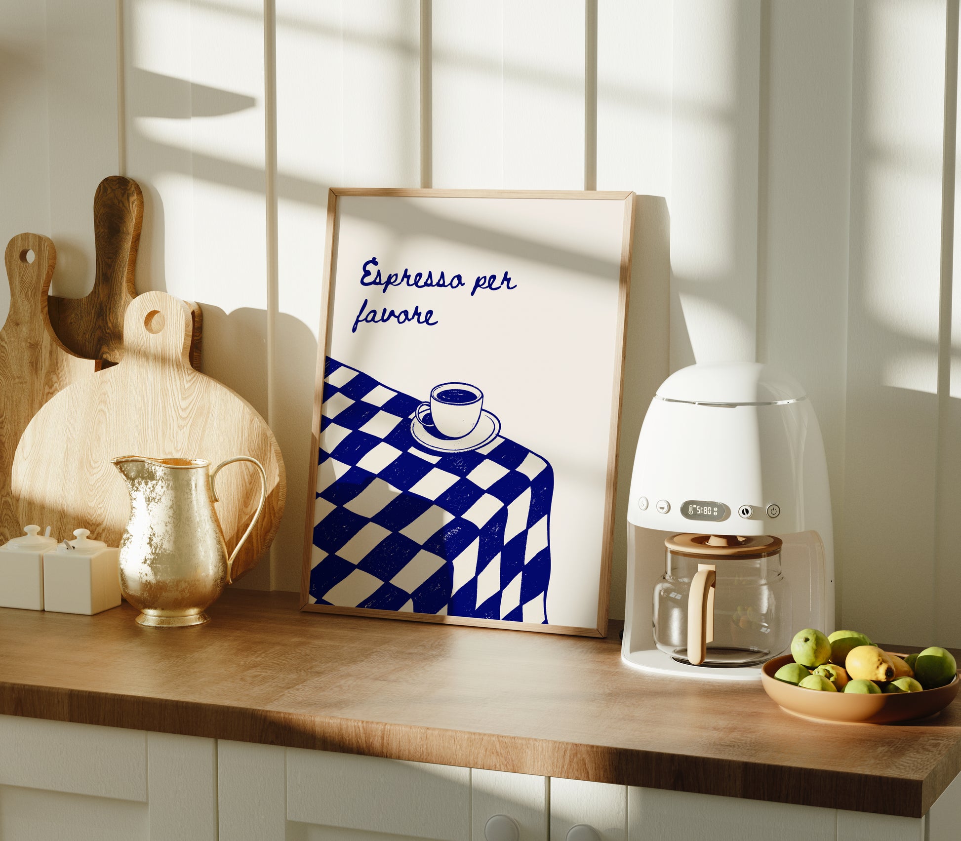 Bring a little Italian caffé magic into your home. This Espresso per favore art print blends coastal charm with warm Mediterranean tones. The aesthetic print adds soft café vibes to your kitchen, dining area, or gallery wall and lets you create your own cozy Italian coffee corner at home. Perfect for coffee lovers and anyone who dreams of slow mornings in Italy.