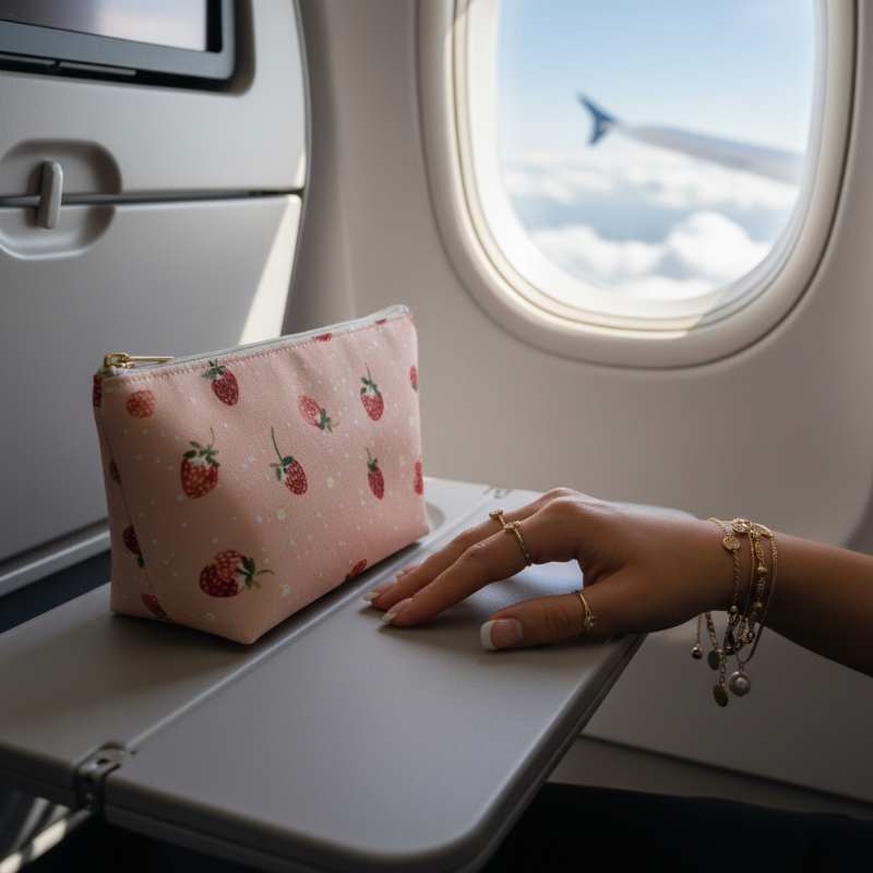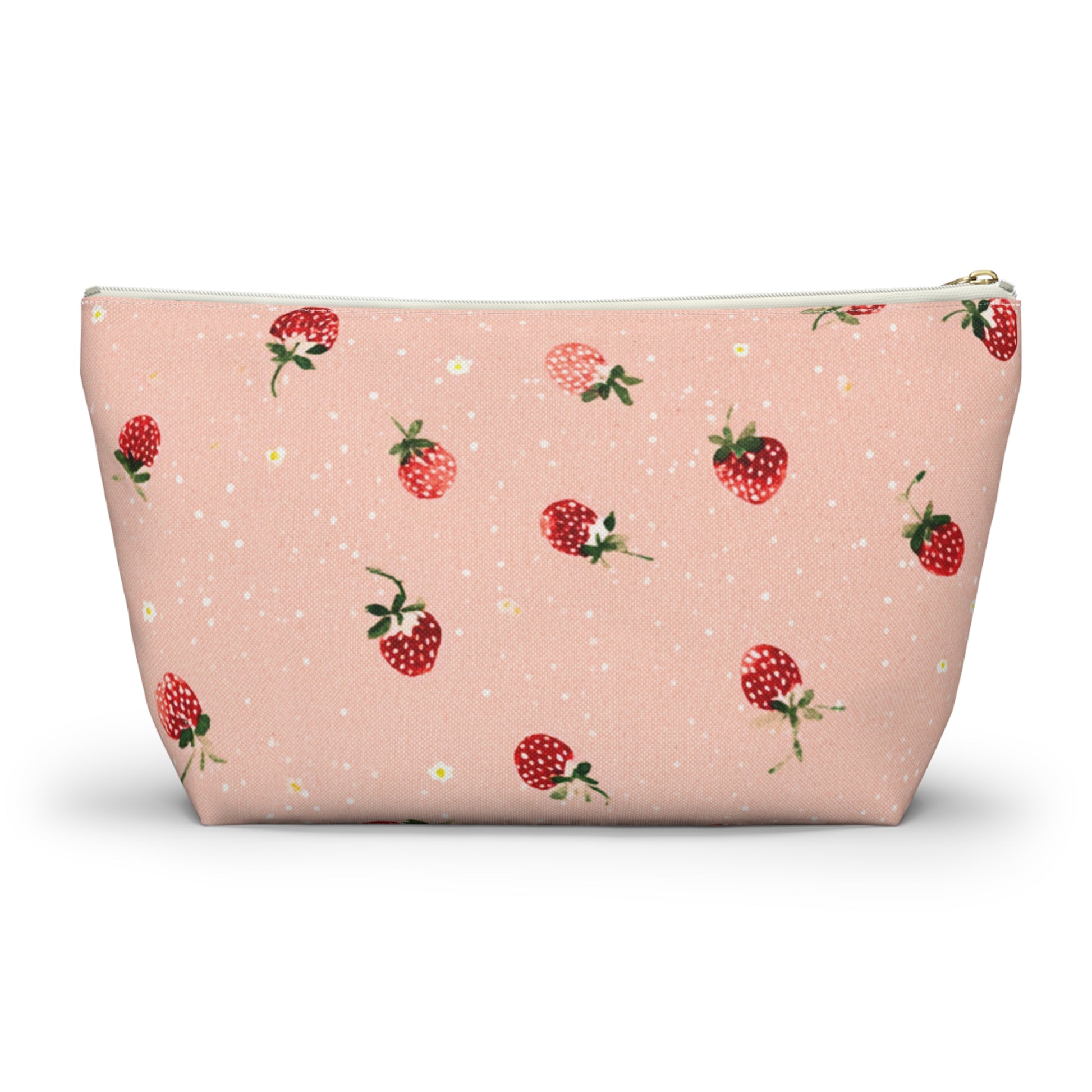 Bring some joy to your travels with this cute strawberry print travel pouch. Elevate your everyday essentials with this beautifully designed pouch featuring a strawberry pattern on a soft rosé background. Perfect for storing your airplane must-haves, makeup, stationery, or small treasures, it keeps everything neatly in place while adding a splash of joy and elegance to your routine.